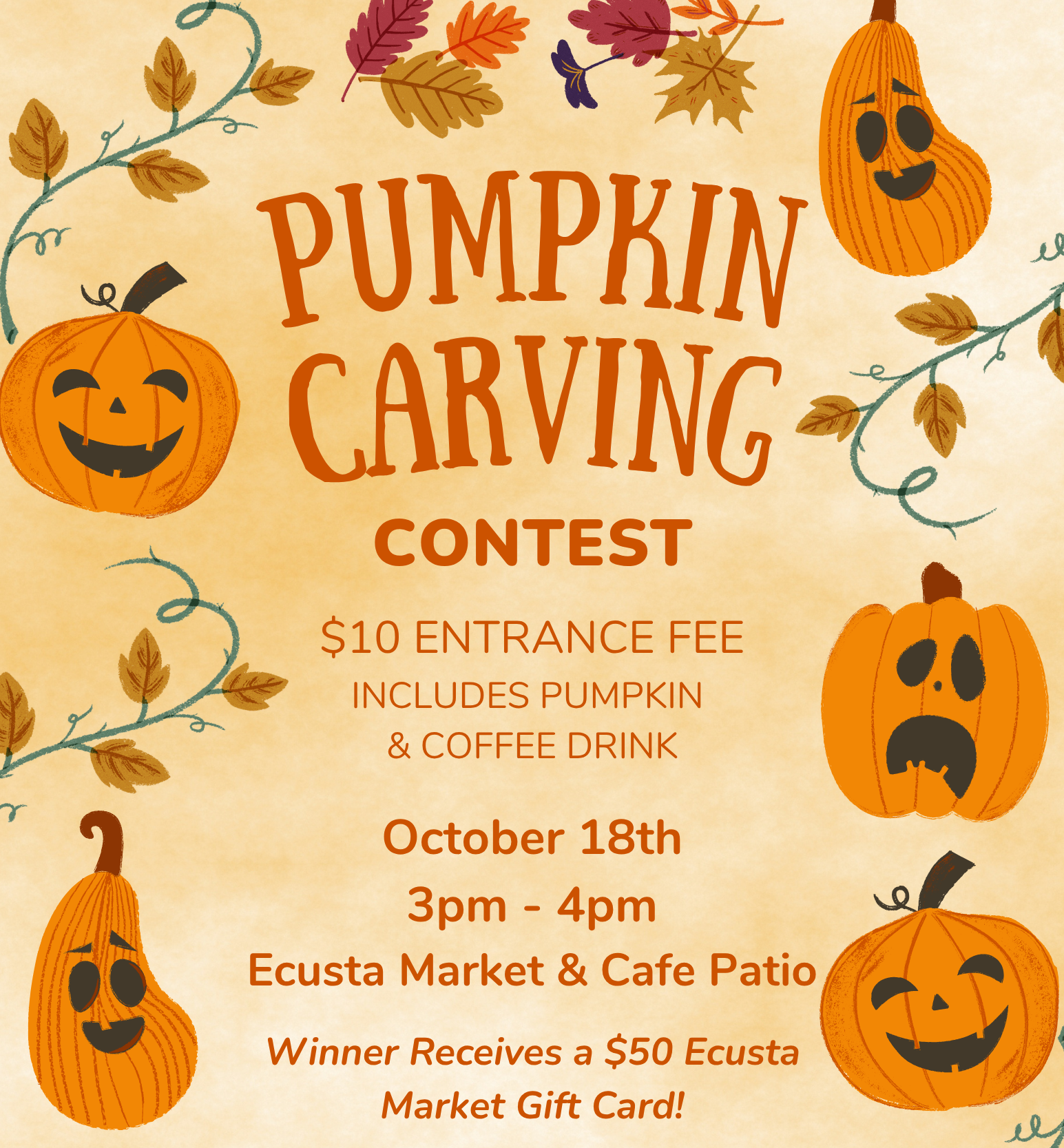 Pumpkin Carving Contest (3–4) — $10 entry includes pumpkin + one café drink. Audience votes; winner announced at 7:15 with a $50 Ecusta gift card prize. Spaces are limited so reserve yours today! Sign Up Here